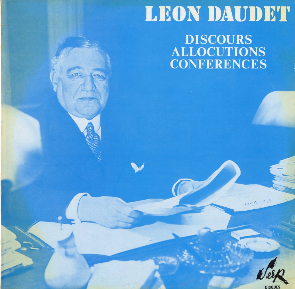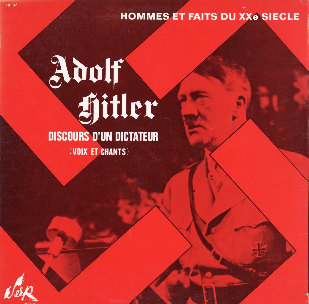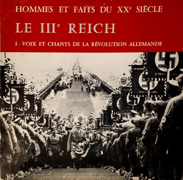 On pourrait continuer notre série et y ajouter la pochette des discours de Léon Daudet, ou encore celles de la guerre d’Algérie, ou qui traitent du IIIe Reich sur lesquelles on peut noter au passage que le disque « Le IIIe Reich, voix et chants de la révolution Allemande » a valu à la SERP une condamnation pour apologie de crimes de guerre en 1968. En cause ? L’image qui figure un Hitler triomphant comme chef de guerre d’une armée en ordre de bataille et le texte de la 4e de couverture qui décrit la montée d’Hitler au pouvoir comme « populaire et démocratique » (énorme sic.).