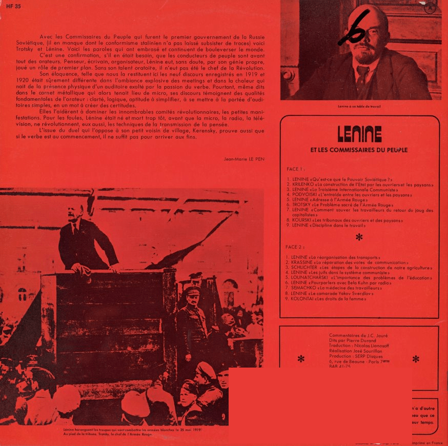 Quant au disque traitant de Lénine, il pourrait apparaitre comme un contrexemple car sa couverture n’adopte pas les mêmes tons rouges que celle des autres figures de gauche déjà mentionnées. Mais il n’en est rien, d’une part, la 4e de couverture reprend les tons rouges déjà mentionnées et de l’autre : ce disque n’est pas uniquement le disque des discours de Lénine, il est intitulé “Lénine et les commissaires du peuple” et reprends, en plus de ceux de Lénine, des discours de Trotski, de Kourski, d’Alexandra Kolontaï…