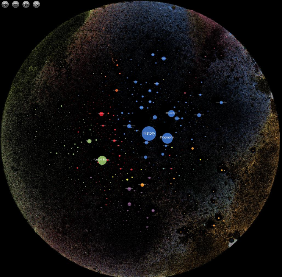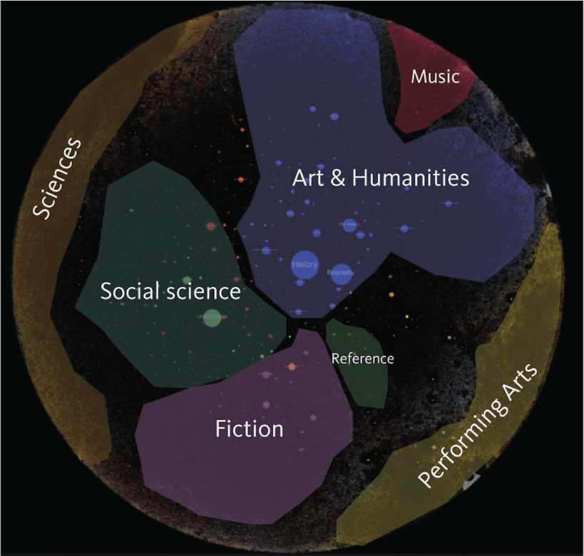 Techniquement parlant, cette visualisation utilise les descripteurs MARC d’indexation de chaque item et les affiche sous forme de points colorés : plus un point est gros, plus il y a d’ouvrages le concernant dans la bibliothèque publique de New York ; si deux sujets sont souvent mentionnés ensemble, par exemple Jeux Olympiques et sport, on en déduit qu’ils sont liés d’une manière ou d’une autre et ils se voient attribuer la même couleur.