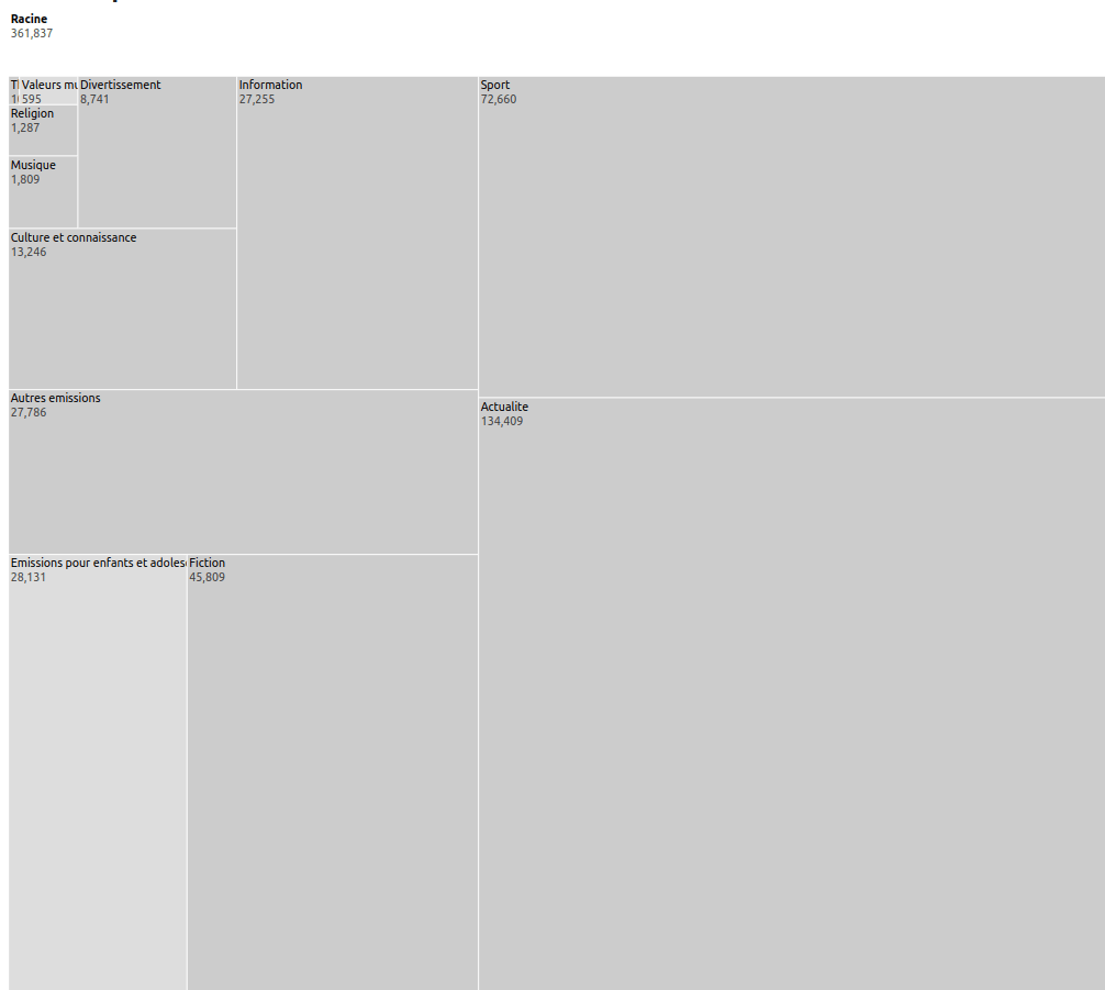 Éclairons notre propos avec l’exemple de la RTS où durant notre stage on a voulu effectuer une démarche similaire pour proposer un outil de navigation sous forme de treemap hiérarchique en utilisant les “codes contenus” qui sont des métadonnées fournies pour chaque document renseignant sa thématique de façon hiérarchique, par exemple un téléjournal aura le code contenu “Actualité”.