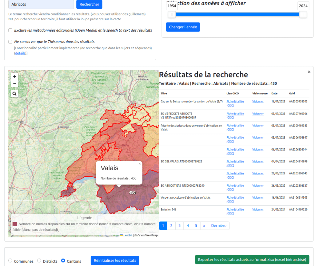 D’abord, donc, la carte interactive des contenus (visible sur cette page) qui se présente, comme son nom l’indique, sous forme d’une carte de la Suisse avec la possibilité de naviguer entre les différents niveaux territoriaux du pays : cantons, districts et communes. Elle permet, en un seul regard, d’observer les territoires pour lesquels la RTS conserve le plus d’archives et de cliquer sur ces derniers pour consulter les archives qui s’y réfèrent. Elle combine les niveaux de lecture spatiaux et temporels décrits plus haut en permettant aux utilisateurs de naviguer dans le temps pour observer les variations dans la collection. Par ailleurs, ils ont la possibilité d’inclure un terme de recherche pour observer la répartition géographique de ce terme. Par exemple, dans l’image ci-après, on a tapé « abricots » et on observe que le canton le plus représenté est le Valais19. Cette carte n’est donc pas uniquement un outil d’exploration, elle permet aussi de réaliser des statistiques à partir des recherches effectuées en proposant un export (au format Excel) de ce qui est visualisé. L’image est ici synoptique, elle permet de voir plusieurs temporalités et états dans le même temps, c’est un choix sémantique fort mais qui peu parfois être complexe pour l’utilisateur, c’est pourquoi d’autres projets préfèrent scinder les possibilités heuristiques en plusieurs visualisations. Tel est le cas de la bibliothèque du Congrès et de son tableau de bord.