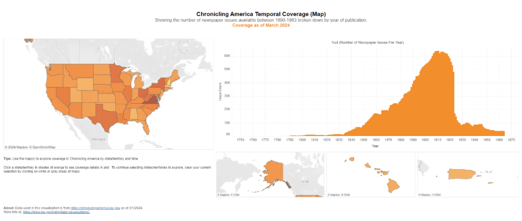 Chronicling America Maps and Visualizations – National Digital Newspaper Program (Library of Congress), url : https://www.loc.gov/ndnp/data-visualizations/ (visité le 19/08/2024).