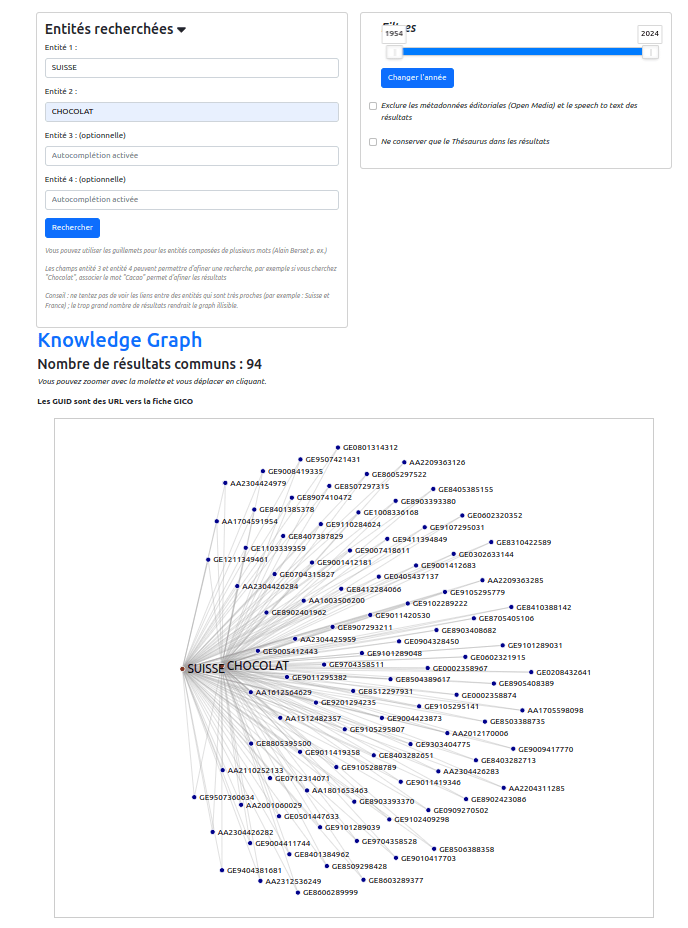 On a donc ici deux approches similaires, mais avec des visées différentes, la première approche est plus du côté de l’interface de navigation dans les collections, la seconde est statistique. Dans les deux cas, on offre aux utilisateurs la possibilité de voir dans son ensemble un fonds extrêmement volumineux en proposant des clés de lecture variées. Soit elles sont combinées dans une seule visualisation à l’aide de filtres, soit elles sont séparées en deux visualisations différentes. Cette vision d’ensemble permet aux personnes consultant les fonds de ne pas tomber dans certains écueils. Par exemple, dans le cas de la RTS, étant une chaîne romande, la majorité des sujets concerne la région linguistique francophone. Si l’on souhaite effectuer une recherche sur des cantons italophones ou germanophones, ce ne sera pas l’endroit le plus pertinent. Ce type d’interface répond donc à de multiples problématiques : donner une vision d’ensemble et des clés de lecture différentes d’un fonds ; permettre une interprétation quantitative ; être utilisé dans des actions de valorisation tout en limitant le syndrome de la barre de recherche blanche. Par ailleurs, la multiplicité des filtres permet une granularité de navigation très importante donnant de nombreuses opportunités de se concentrer sur des documents spécifiques19. Combiner différentes clés de lecture (dans le cas de la RTS, nous avons ajouté à cette visualisation un knowledge graph visible plus bas) en prenant en compte le fait que chacune permet de capturer un aspect spécifique de la collection est donc une stratégie intéressante dans le cadre d’objets culturels complexes. Par ailleurs, cela permet de créer des possibilités pour les utilisateurs de faire des découvertes par sérendipité, car ce type d’interface les laisse « flâner » dans les collections comme le notent Thudt et al.20. En revanche, comme le notent Florian Windhager et al., réaliser des interfaces généreuses combinant de nombreuses visualisations et possibilités de filtrage peut recréer la problématique de fatigue muséale en créant ce que les auteurs appellent le « split attention challenge »21. Les interfaces, de même que les bâtiments, auxquels elle prétendent se substituer, doivent donc – tout en restant généreuses – ne pas proposer trop de niveaux de lecture et rester simples d’utilisation, car dans les deux cas, cela résulte en un usager perdu : dans l’immensité de l’espace physique ou virtuel (ici aussi, le site François-Mitterrand est éclairant).